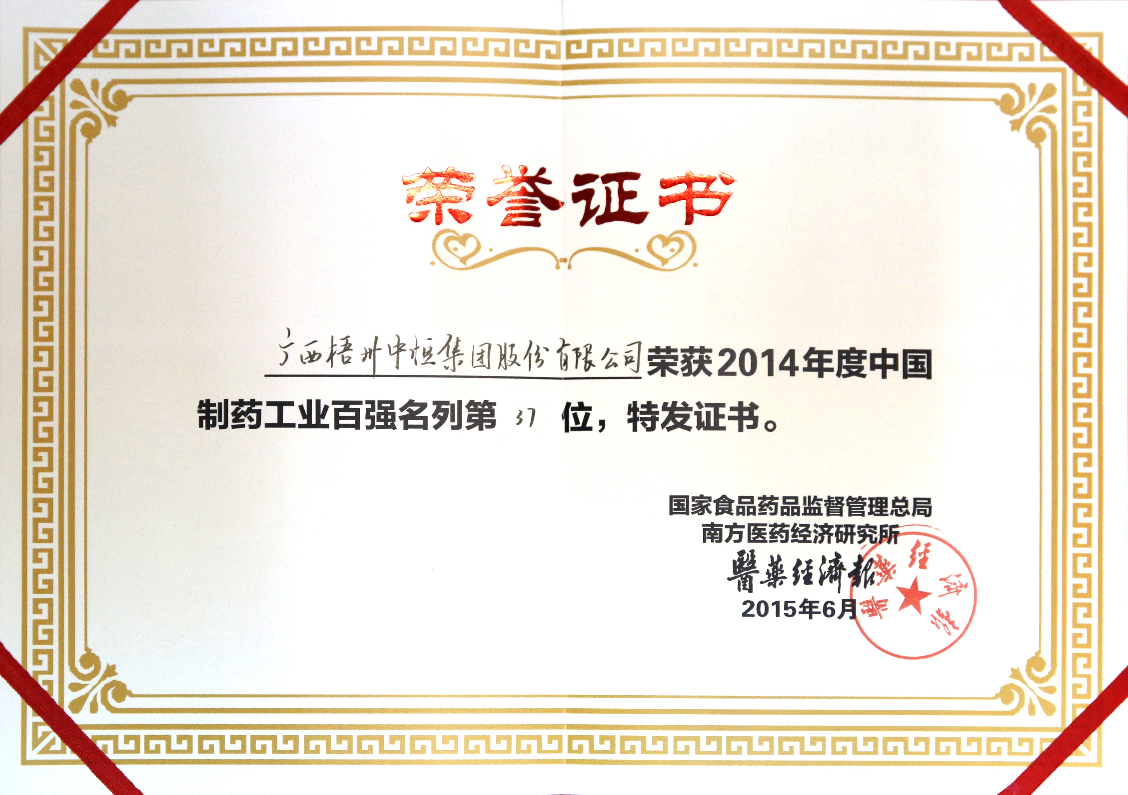 榮獲2014年度中國制藥工業(yè)百強(qiáng)名列第37位