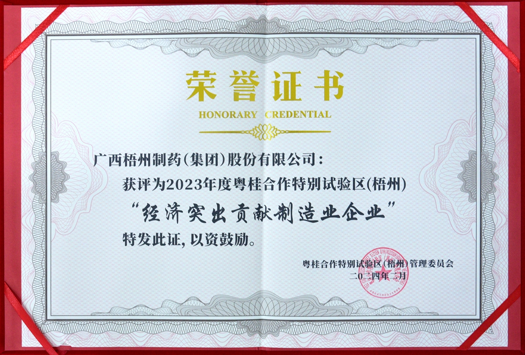 廣西梧州制藥(集團(tuán))股份有限公司獲評(píng)為2023年度粵桂合作特別試驗(yàn)區(qū)(梧州)經(jīng)濟(jì)突出貢獻(xiàn)制造業(yè)企業(yè)