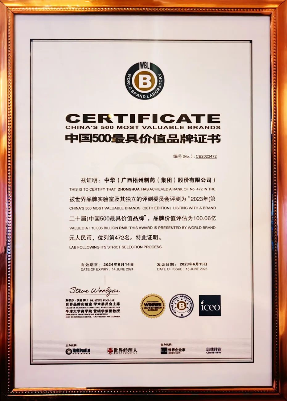 中華跌打丸為梧州制藥獨家生產(chǎn)品種,自1966年批準(zhǔn)生產(chǎn)至今已經(jīng)臨床應(yīng)用五十余年,先后收錄于2005版、2010版、2015版、2020版、2025版《中國藥典》,憑借其顯著的消腫止痛、舒筋活絡(luò)、止血生肌、活血祛瘀功效,在骨科治療領(lǐng)域深受認(rèn)可。曾獲國家醫(yī)藥管理總局優(yōu)質(zhì)產(chǎn)品獎、中華人民共和國國家質(zhì)量獎銀獎等榮譽稱號,核心發(fā)明專利榮獲中國專利優(yōu)秀獎,廣西發(fā)明創(chuàng)造成果展覽獎。其產(chǎn)品商標(biāo)是目前我國醫(yī)藥領(lǐng)域唯一一個獲準(zhǔn)使用的“中華”商標(biāo),2023年“中華”品牌入選世界品牌實驗室發(fā)布的“中國500最具價值品牌”榜單,品牌價值評估超100億元,為當(dāng)年度廣西唯一入選該榜單的醫(yī)藥品牌。