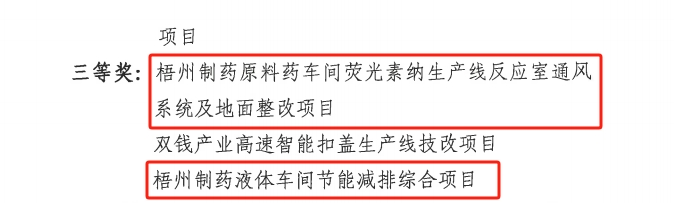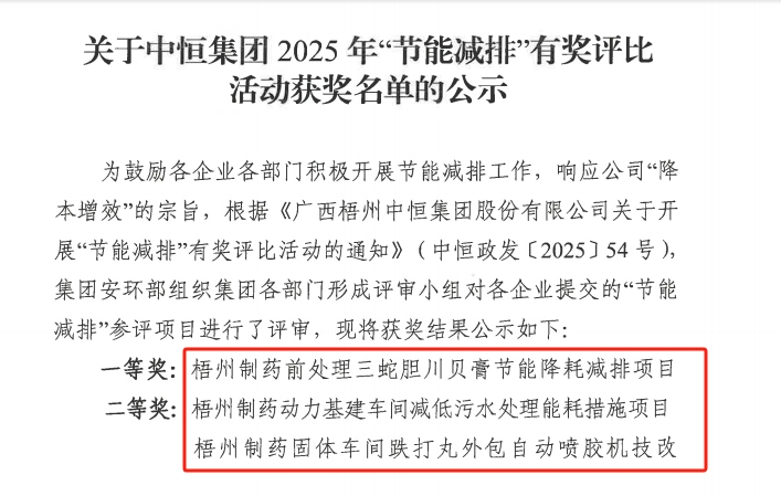 近日,在中恒集團(tuán)“節(jié)能減排”2025年有獎(jiǎng)評(píng)比活動(dòng)中,梧州制藥多項(xiàng)目脫穎而出,包攬一、二、三等獎(jiǎng)。其中,前處理車(chē)間三蛇膽川貝膏節(jié)能降耗減排項(xiàng)目獲一等獎(jiǎng);動(dòng)力基建車(chē)間減低污水處理能耗措施項(xiàng)目、固體車(chē)間跌打丸外包自動(dòng)噴膠機(jī)技改項(xiàng)目獲二等獎(jiǎng);原料藥車(chē)間熒光素鈉生產(chǎn)線反應(yīng)室通風(fēng)系統(tǒng)及地面整改項(xiàng)目、液體車(chē)間減排綜合項(xiàng)目獲三等獎(jiǎng)。