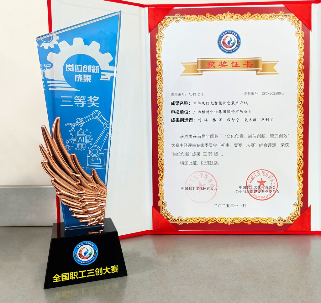 廣西梧州制藥(集團(tuán))股份有限公司中華跌打丸智能化包裝生產(chǎn)線榮獲“崗位創(chuàng)新“成果 三等獎