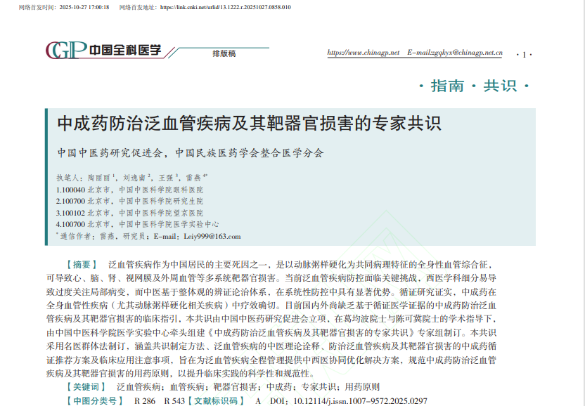 此次發(fā)布的專家共識(shí),由葛均波院士、陳可冀院士擔(dān)任學(xué)術(shù)指導(dǎo),匯聚了43位來自全國(guó)19個(gè)省、自治區(qū)、直轄市,專業(yè)領(lǐng)域覆蓋心血管、腦血管、腎臟、眼、外周血管及內(nèi)分泌等泛血管疾病核心方向的權(quán)威專家。