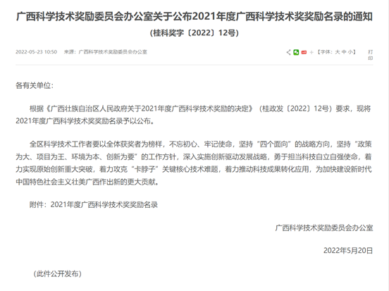 近日,廣西科學(xué)技術(shù)獎勵委員會辦公室發(fā)布《關(guān)于公布2021年度廣西科學(xué)技術(shù)獎獎勵名錄的通知》(桂科獎字〔2022〕12號),2021年度廣西科學(xué)技術(shù)獎揭曉,162項(xiàng)科技成果榜上有名,其中梧州制藥與天津中醫(yī)藥大學(xué)、浙江大