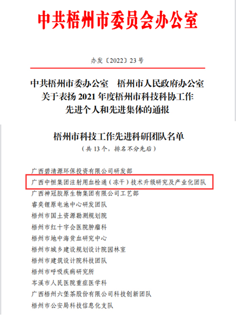 近日,中共梧州市委辦公室、梧州市人民政府辦公室發(fā)布《關(guān)于表揚(yáng) 2021年度梧州市科技科協(xié)工作先進(jìn)個人和先進(jìn)集體的通報(bào)》,“注射用血栓通(凍干)技術(shù)升級研究及產(chǎn)業(yè)化團(tuán)隊(duì)”榮獲“梧州市科技工作先進(jìn)科研團(tuán)隊(duì)”稱號。