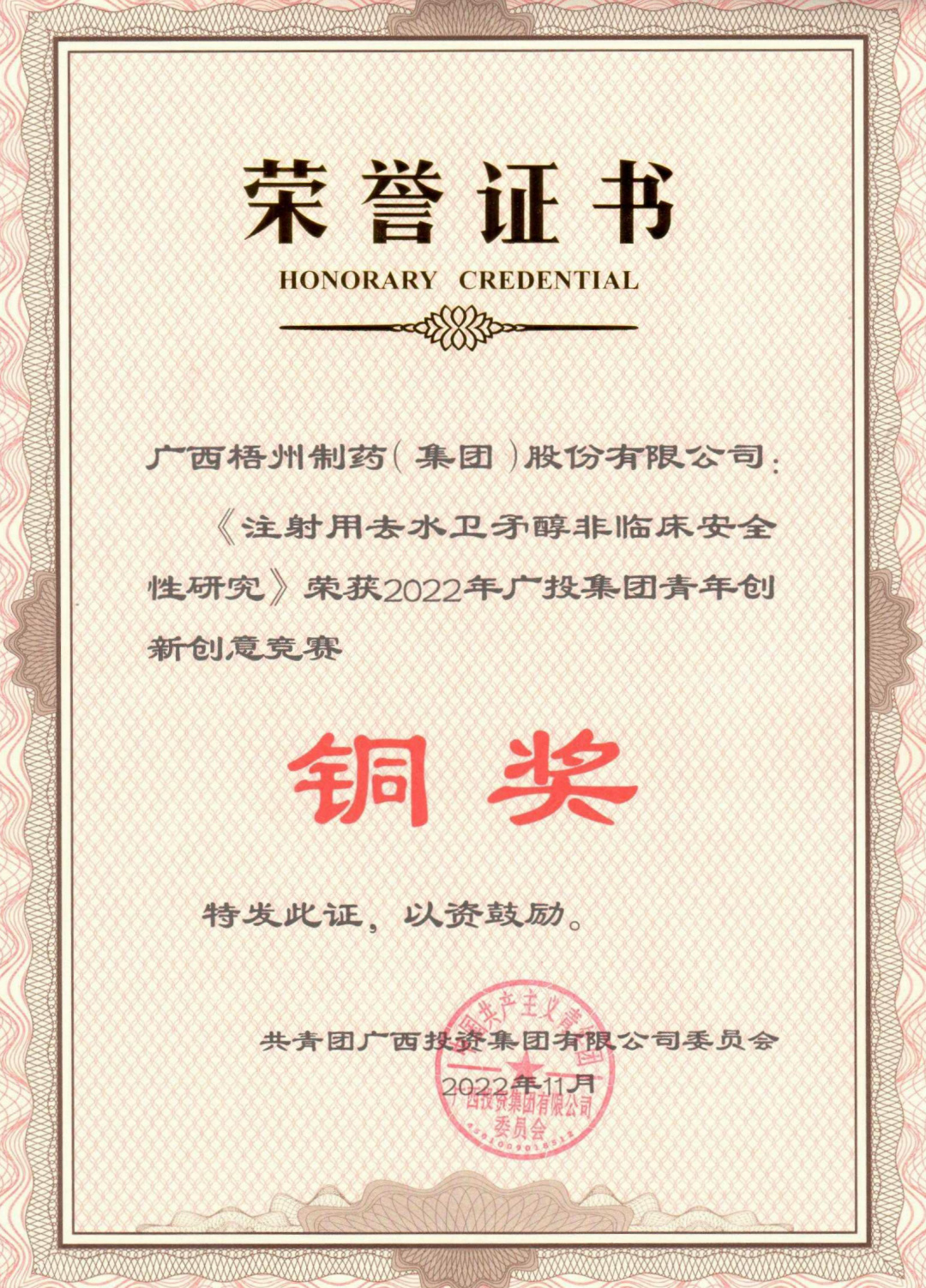 近日,由梧州制藥質(zhì)量保證部組成的梧州制藥代表隊——“質(zhì)量衛(wèi)士”隊,憑借項目《注射用去水衛(wèi)矛醇非臨床安全性研究》獲得2022年廣投集團(tuán)青年創(chuàng)新創(chuàng)意競賽銅獎的表彰。本次競賽共有16個項目最終入圍決賽,通過視頻會議的
